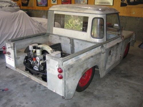 I’ve been building this stupid thing for about 3 years now… powered by a 1961 Porsche 356 Super 90 engine in the back… on a custom frame my buddy Jason and I put together… Cary McCune just finished fabricating the E brake cable mechanism (all custom) to the rear disc brakes. Next up is modifying the Burch exhaust to fit inside the tailgate. This thing is lowered about 15 inches… should be fun when done.